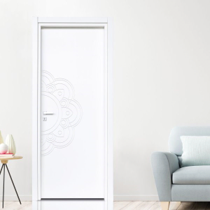 Anta: tamburata di spessore nominale 44mm, intelaiata con massello di abete di sezione 28x40mm, riempimento con nido d’ape microforato supercollato, placcato con pannelli di Mdf di spessore 8mm pantografati di colore bianco laccato.