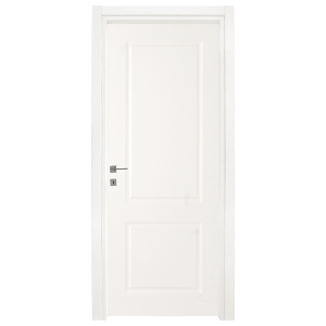 Anta: tamburata di spessore nominale 44mm, intelaiata con massello di abete di sezione 28x40mm, riempimento con nido d’ape microforato supercollato, placcato con pannelli di Mdf stampati a due riquadri di spessore 4mm laccato di colore bianco.