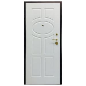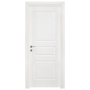 Anta: tamburata di spessore nominale 44mm, intelaiata con massello di abete di sezione 28x40mm, riempimento con nido d’ape microforato supercollato, placcato con pannelli di Mdf stampati a tre riquadri con venature di spessore 4mm laccato di colore bianco.